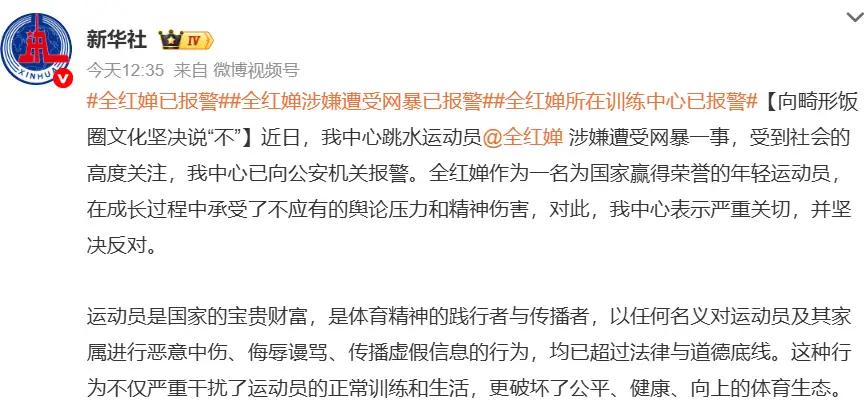 好在,这次全红婵没有忍气吞声。据最新消息,她已经报警。国家体育总局游泳中心也明确表态:将加强国家队建设,完善运动员身心关怀保障体系,全力维护健康清朗的体育舆论环境。