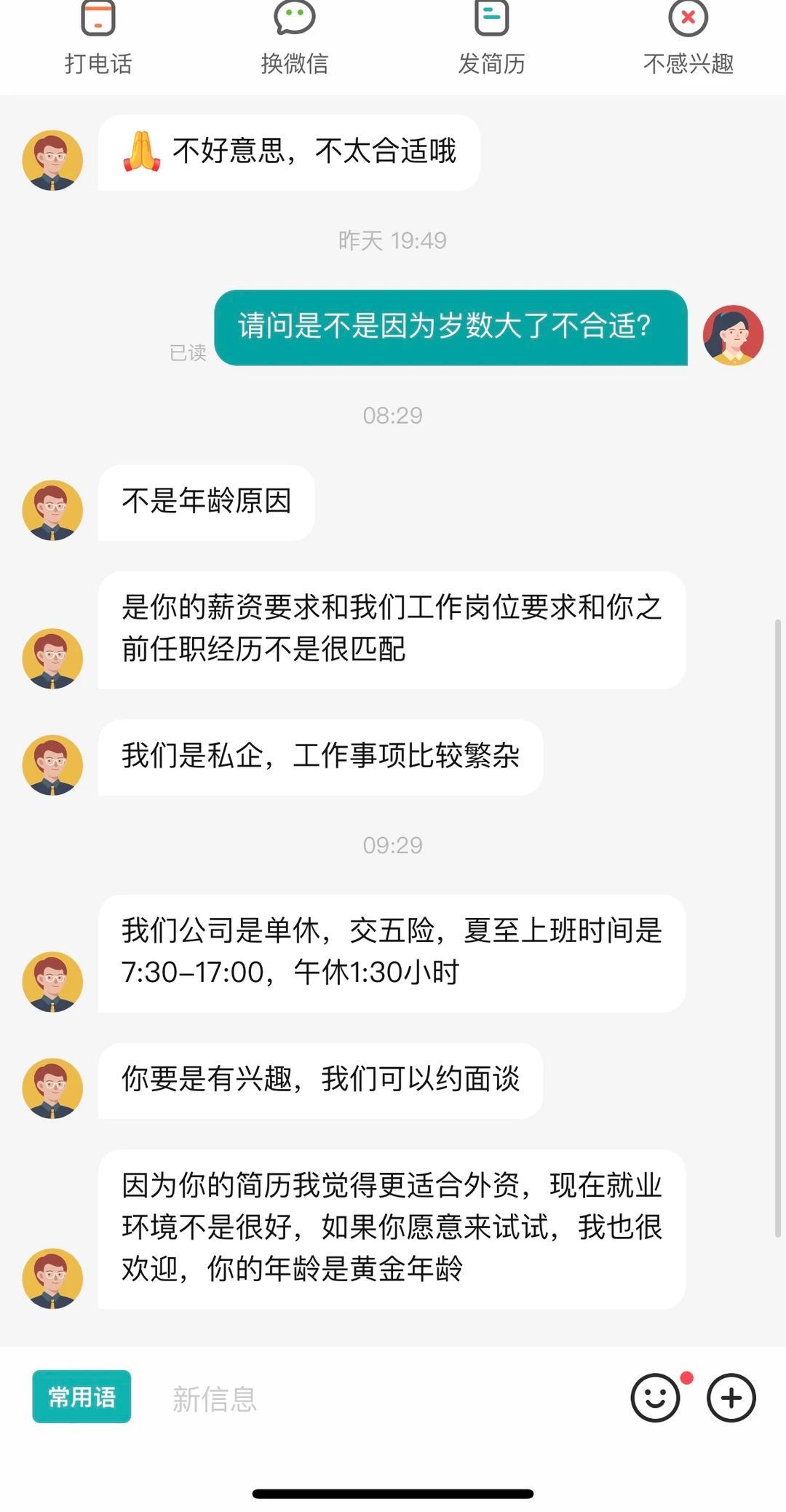 他说来公司面试之前,已经投了两个月简历,投出的简历数量至少上千,但是回音寥寥。他也知道,很多HR 一看 36 岁的年龄,基本上直接划走了。搞得他他自己也焦虑,几乎天天失眠,头发更是不停的掉,让本来头发就不多的脑袋,更加雪上加霜....