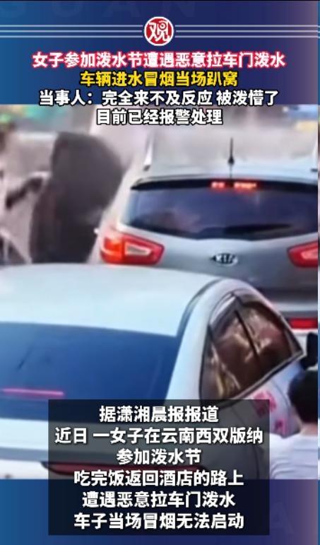 封面新闻---又一起拉车门泼水事件!女子参加泼水节遭恶意拉车门泼水,车辆进水冒烟当场趴窝,当事人:完全来不及反应,被泼懵了,目前已经报警处理