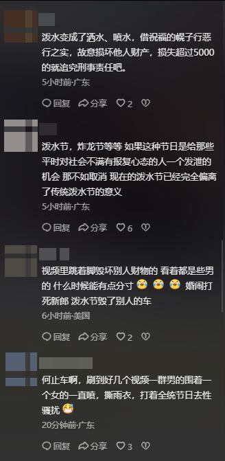 还网友表示,泼水变成了洒水、喷水,借祝福的幌子行恶行之实,故意损坏他人财产,损失超过5000的就追究刑事责任吧。
