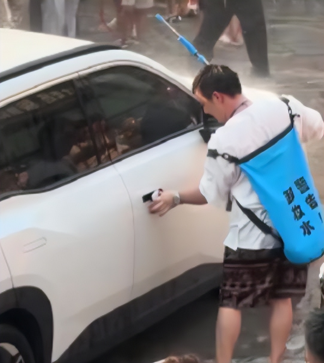 他们对泼水节没概念,不知道要提前锁车门,结果车子被人群团团围住,还有一个背着黄包的男人从后面拉后备箱,一个背着蓝包的男人尝试拉副驾驶的门。
