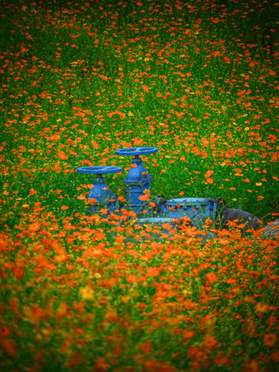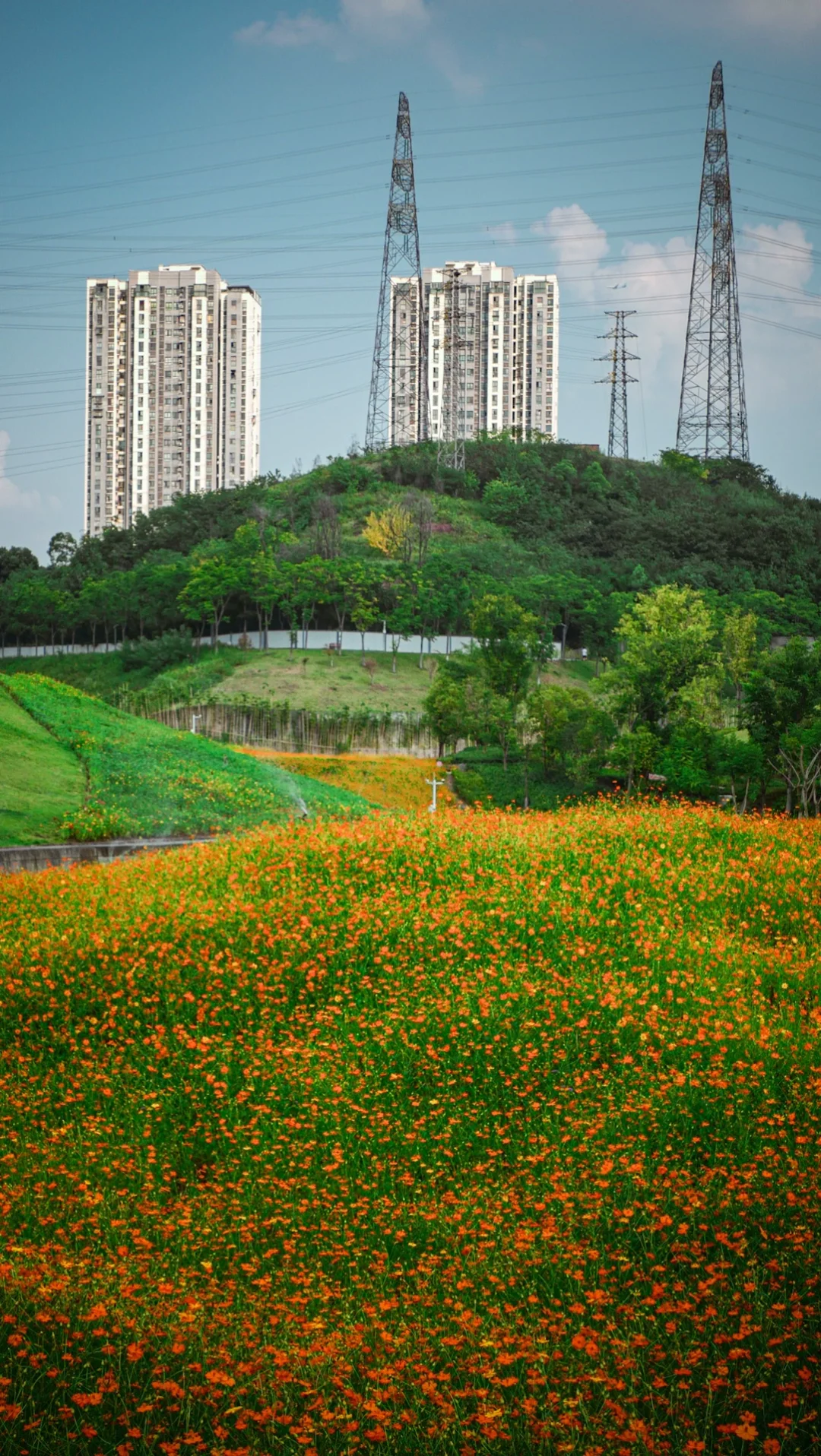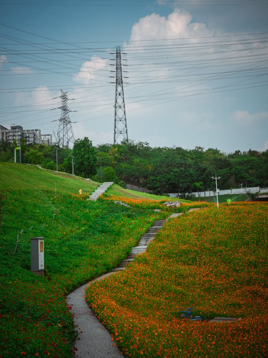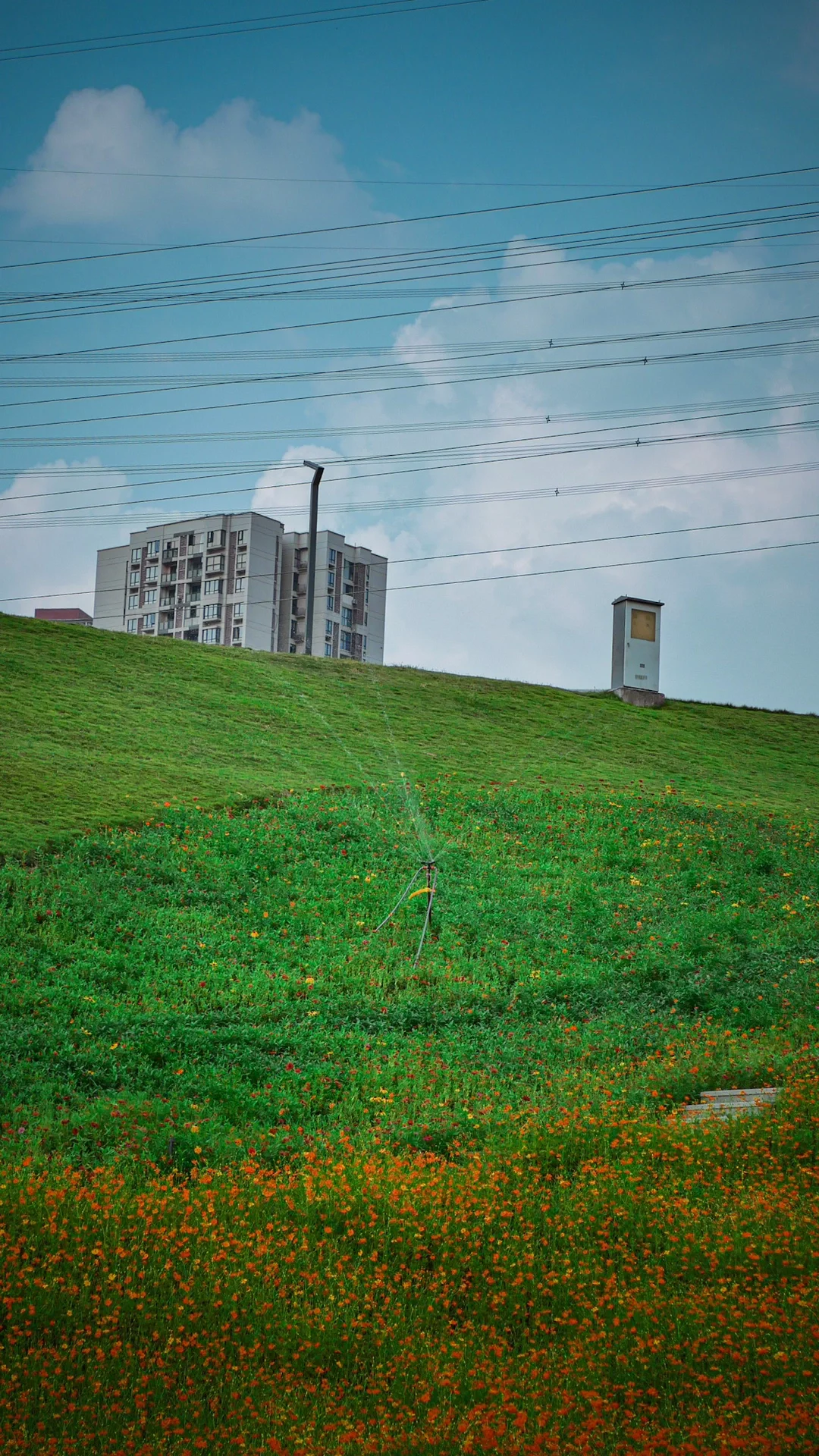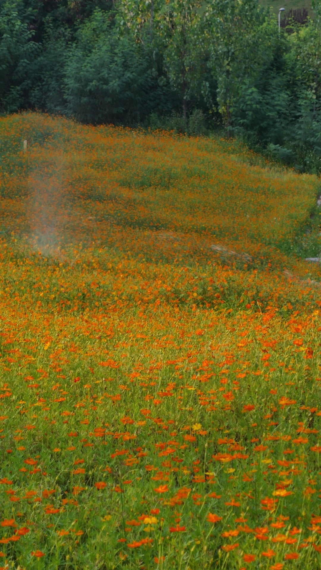花海中间有喷头在不停浇水