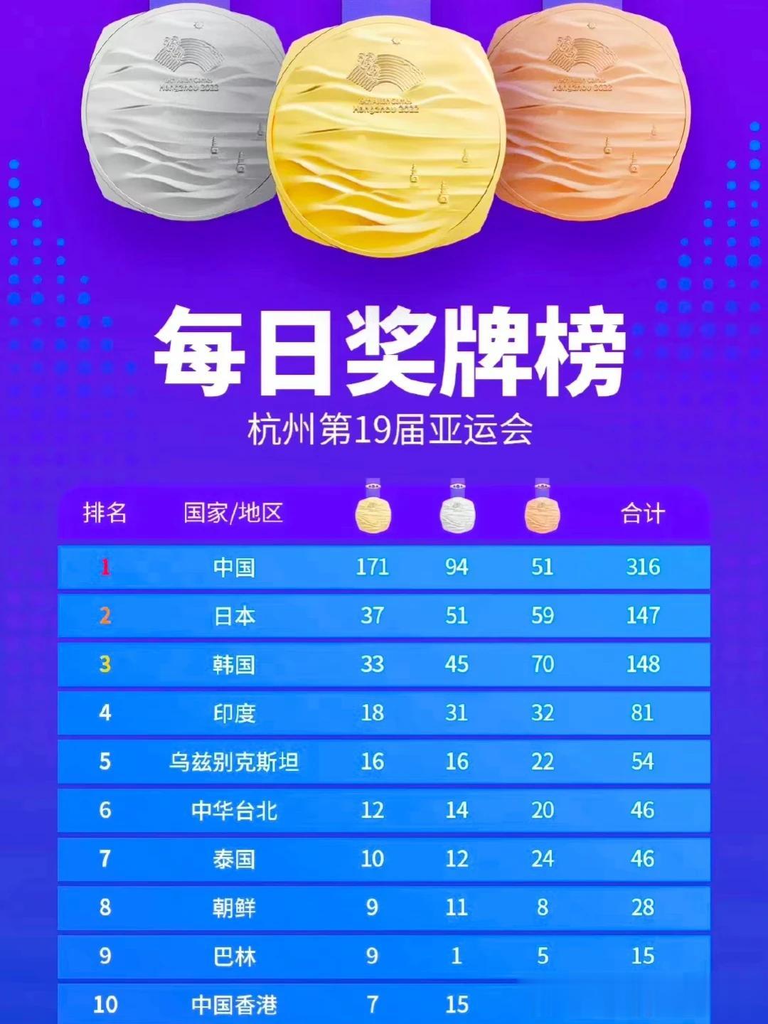 10月4日,杭州亚运会第十一个比赛日,中国体育代表团再夺10枚金牌、4枚银牌、5枚铜牌,以171枚金牌、94枚银牌、51枚铜牌大幅度领先日本、韩国等亚洲诸强,领跑金牌榜、奖牌榜。