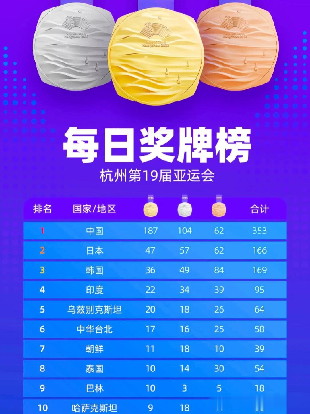 10月6日,杭州亚运会决出30枚金牌,中国体育代表团再夺8枚金牌、5枚银牌、7枚铜牌,目前以共计187枚金牌、104枚银牌、62枚铜牌强势碾压日韩诸强,雄踞金牌榜、奖牌榜首位。 10月7日亚运会将产生46枚金牌。