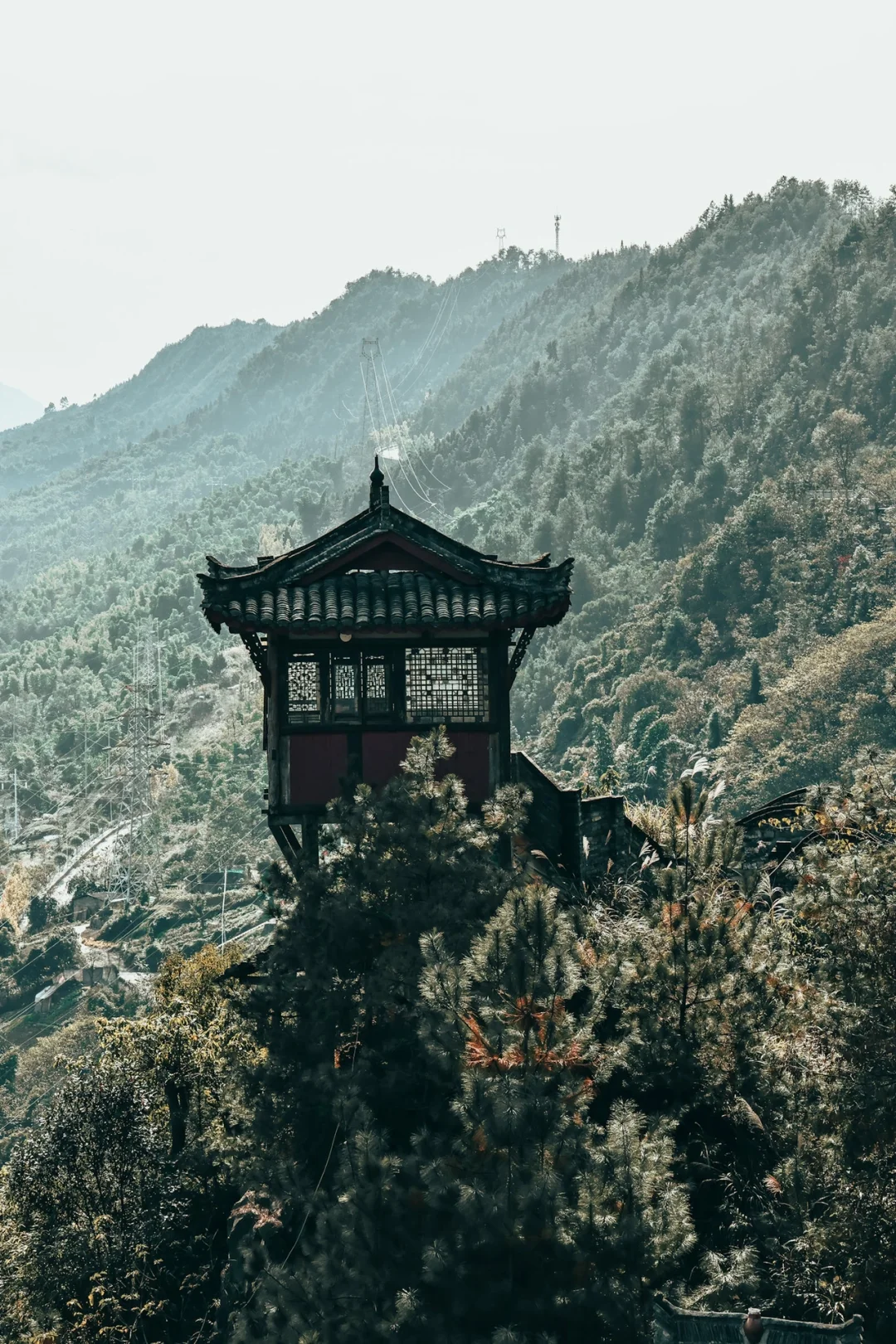 寺院依山而建,林木耸秀,云烟万状