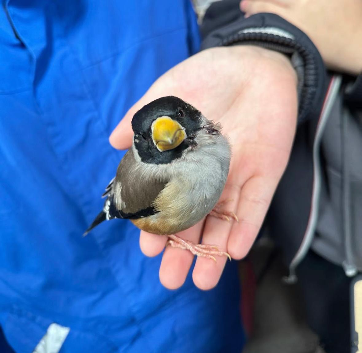头大大的【黑尾蜡嘴雀】撞玻璃可能性很大,让它休息会就好