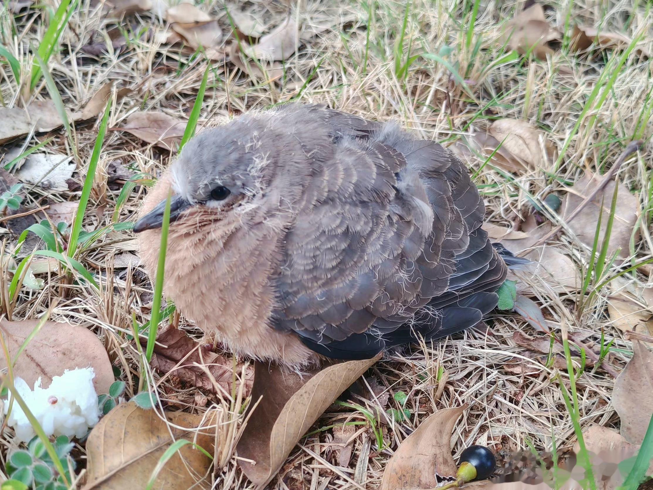 #鸟粉投稿# 地上发现一只【珠颈斑鸠】宝宝天冷得缩成球了 树上掉下来的 给它放头