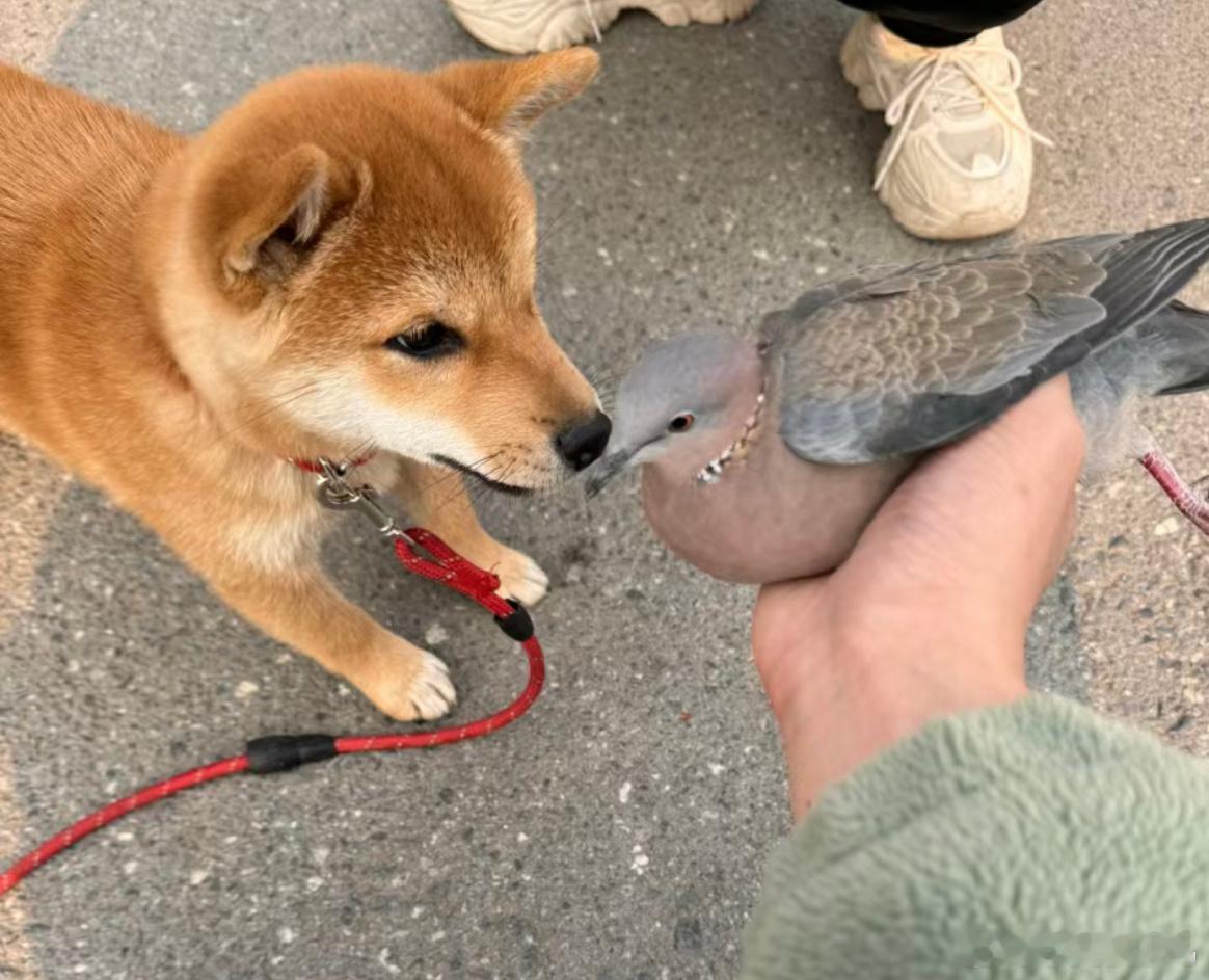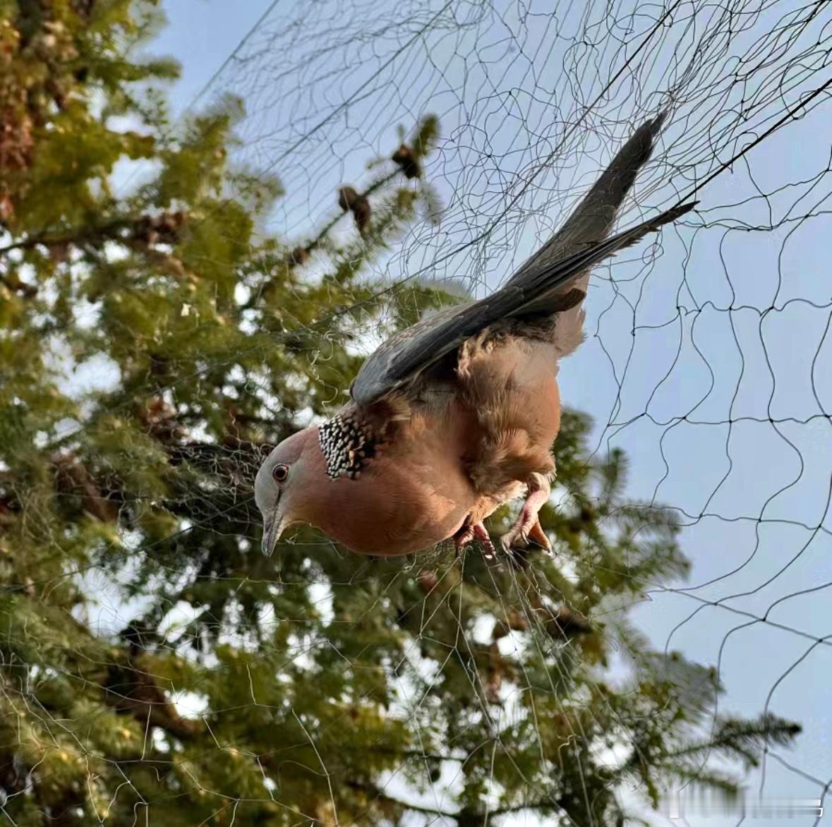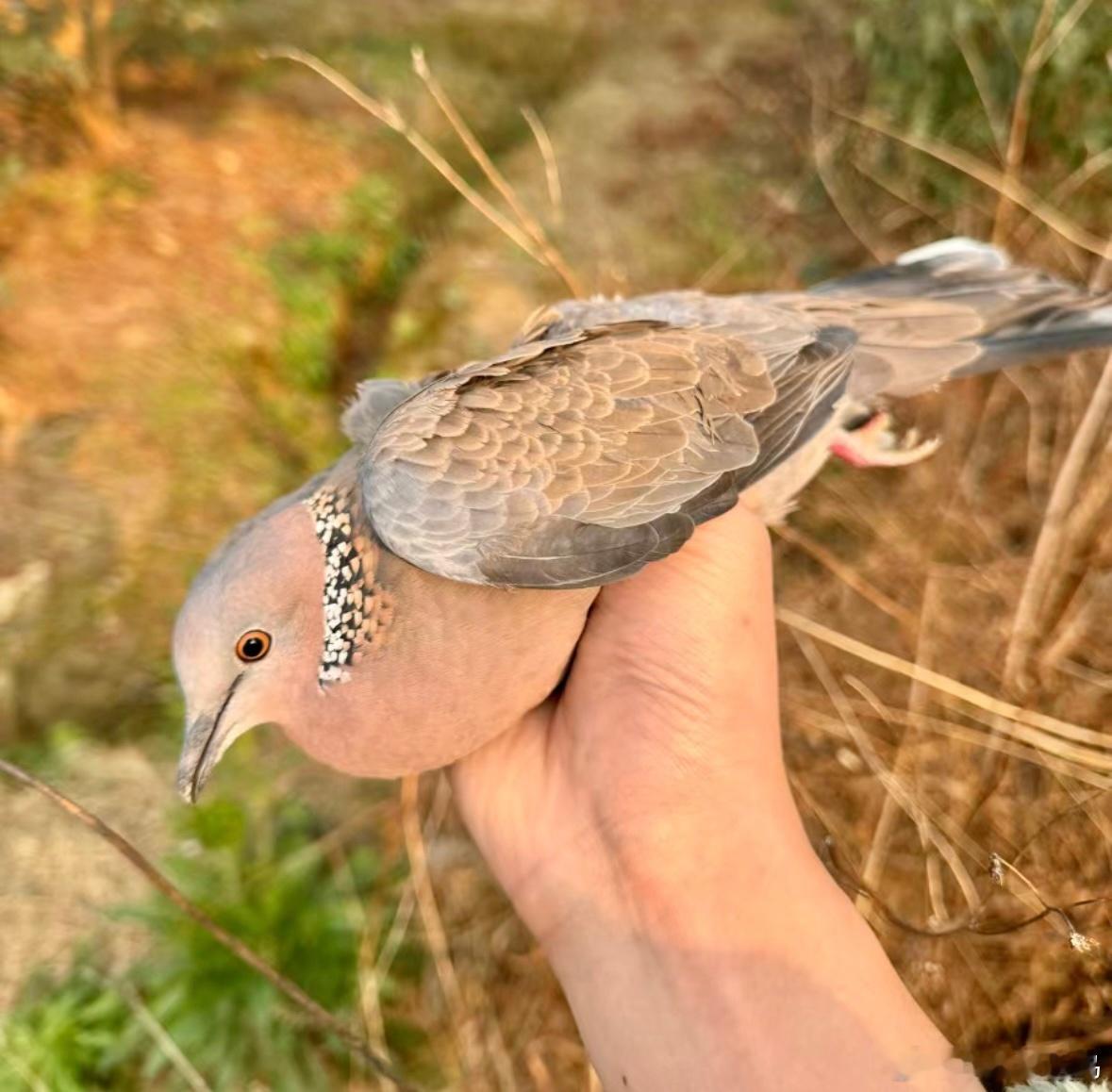 好心人解救下来一只【珠颈斑鸠】估计挂久了现在飞不动了,让它休息会捕鸟网是违法的,