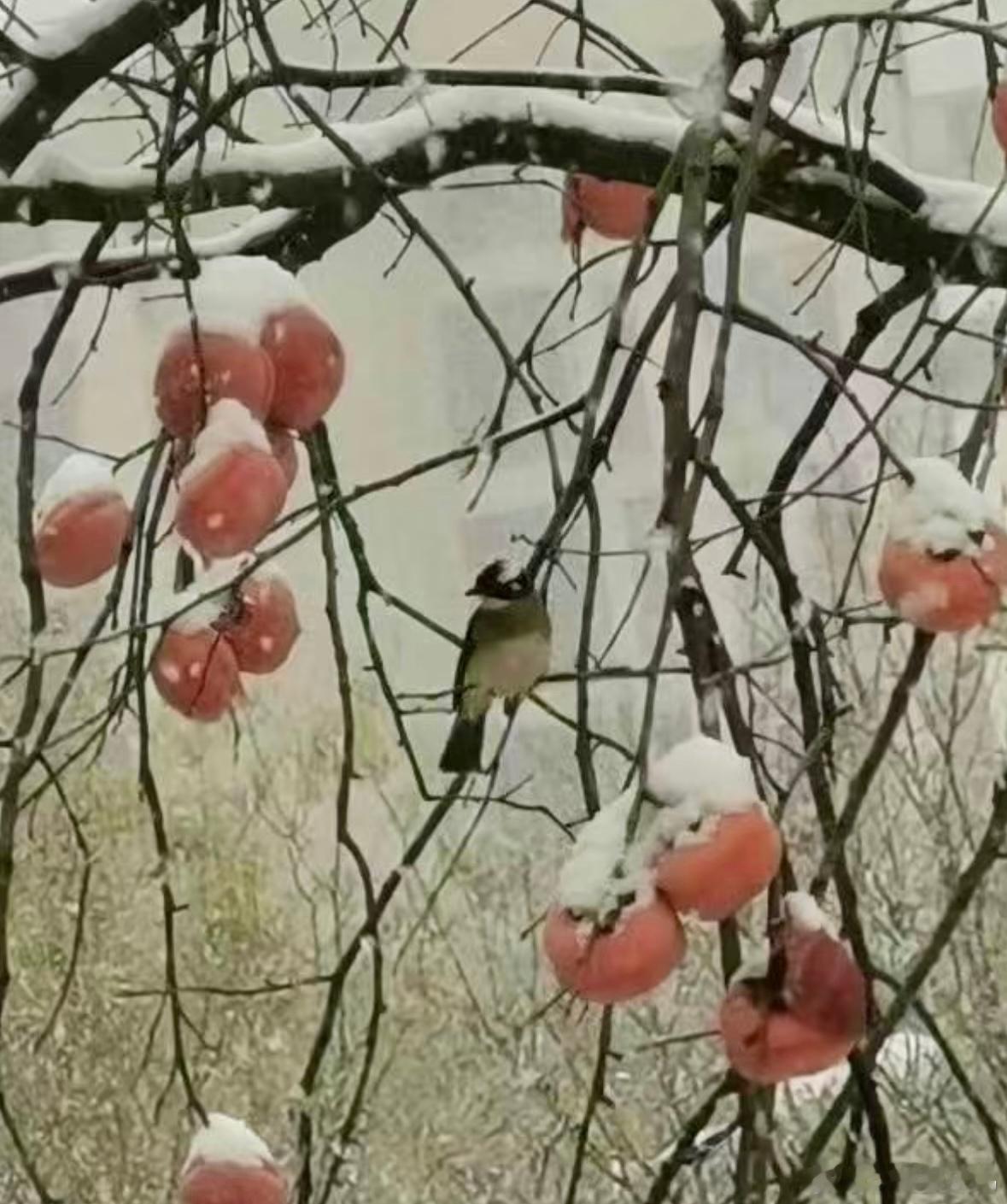 #鸟粉投稿# 吃柿子🍅的【白头鹎bēi】下雪天也在积极干饭