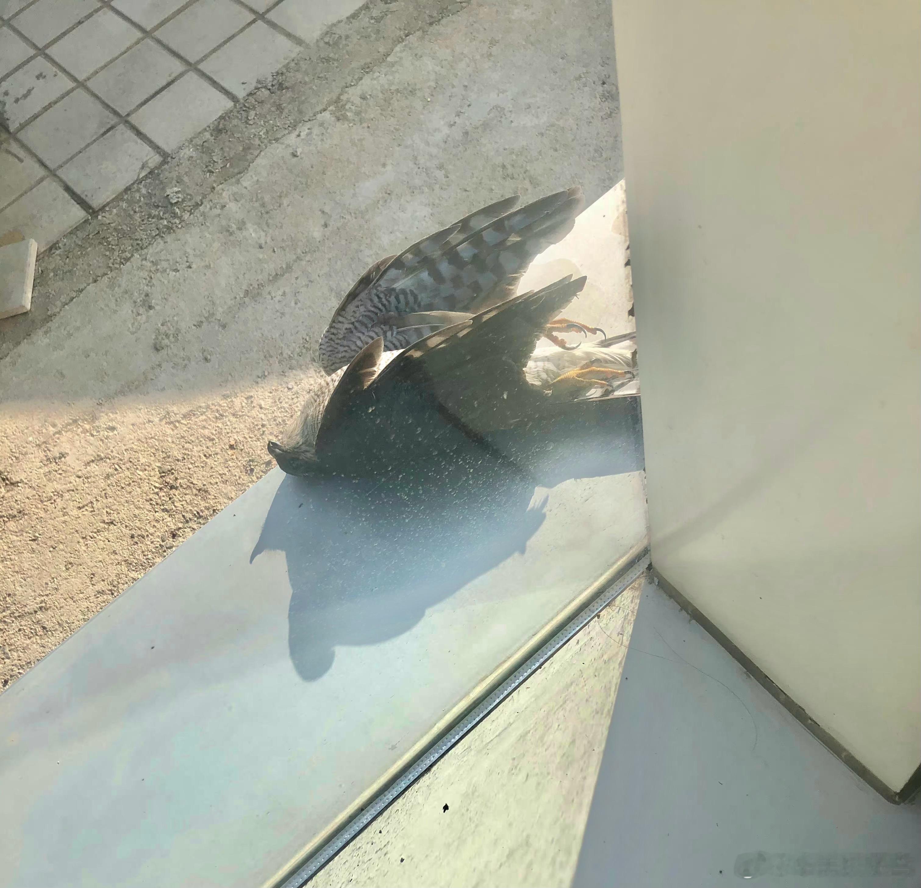#撞玻璃的鸟# 撞玻璃的雀鹰和珠颈斑鸠在追捕的过程中它俩一同撞上了玻璃[泪]鸟撞