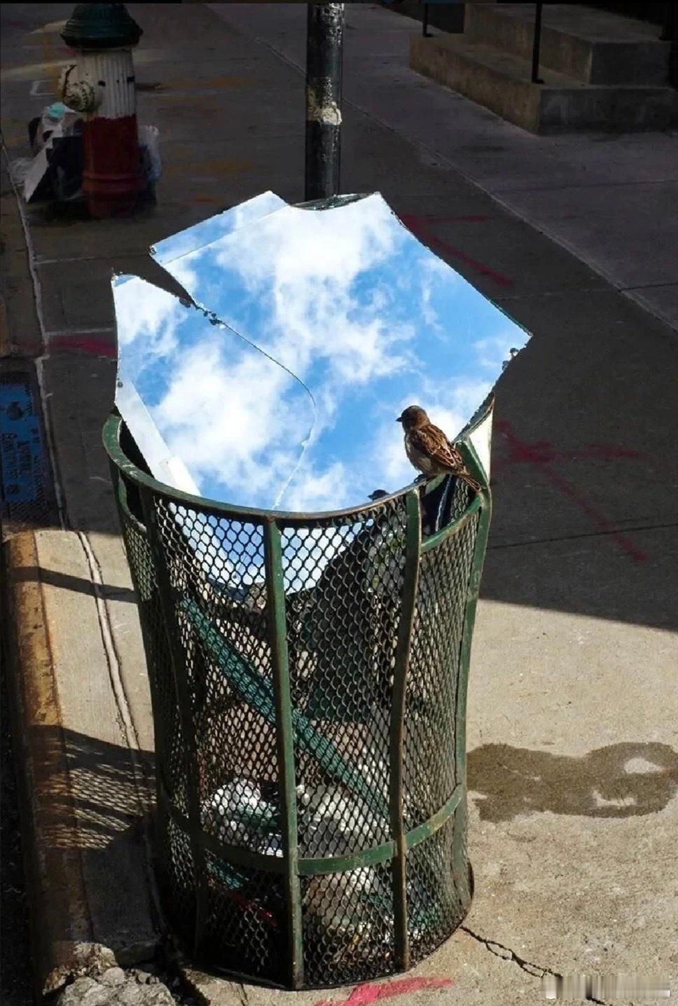 小麻雀望着镜子里的天空