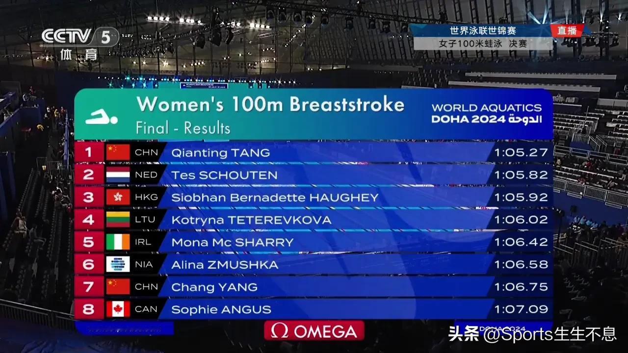 中国19岁小将女子100m蛙泳强势夺金!在北京时间2月14日凌晨刚刚结束的2024世界泳联世锦赛女子100m蛙泳决赛中,中国队唐钱婷以1′05″27的成绩夺得金牌。 中国香港选手何诗蓓获得铜牌,荷兰选手获得银牌。