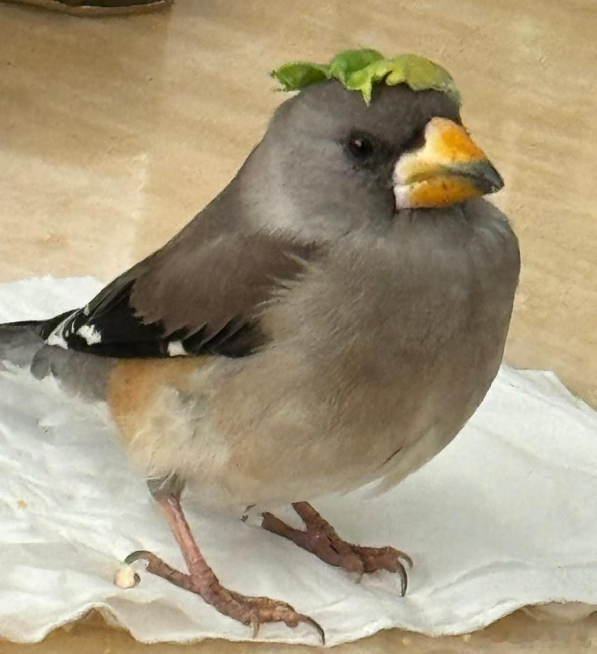 头顶菜叶的【黑尾蜡嘴雀】可以给它放纸盒里,休息会 等精神好点了再带出去放飞