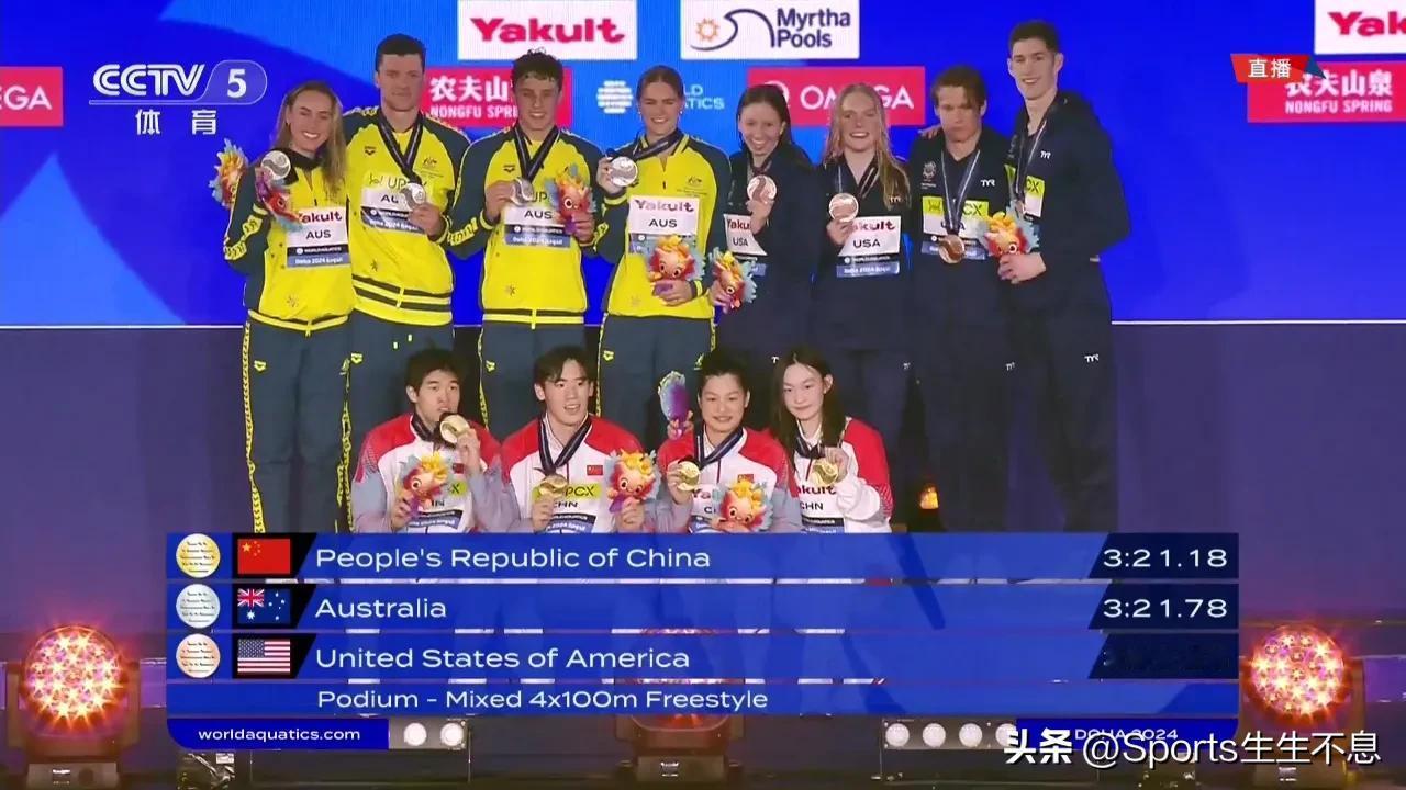 北京时间2月18日凌晨,多哈游泳世锦赛再传捷报,中国男女4×100m自由泳接力队以刷新亚洲纪录的成绩将澳大利亚队、美国队抛在身后勇夺金牌,成绩3′21″18。 潘展乐、王浩宇、李冰洁、余依婷,好样的! 中国游泳健儿,再接再厉!巴黎奥运会!加油!