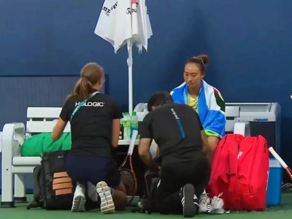 首盘郑钦文状态全无,非受迫失误离谱,出界很多,5-7,盘间申请医疗暂停。
