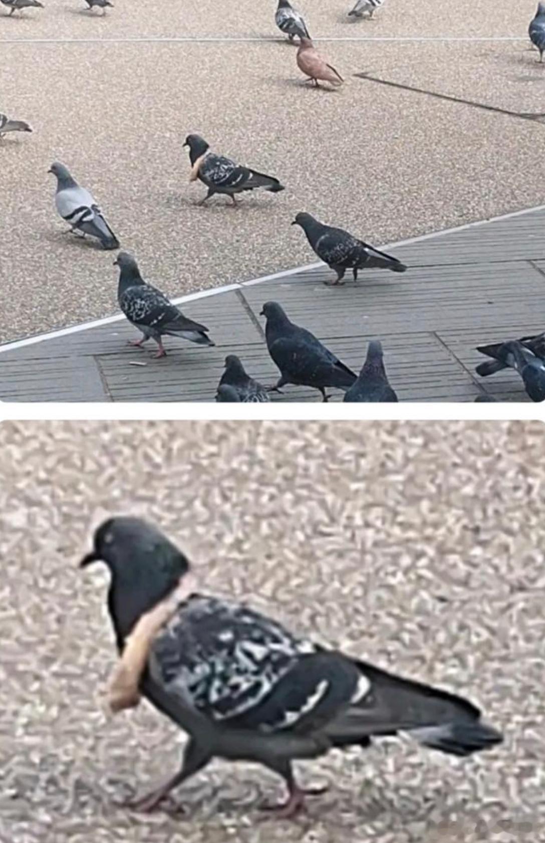 一个沙雕的情况是:鸽子会最先啄食面包中间的柔软部分,这样就留下了边缘一圈比较硬的皮,当咕咕再啄的时候就会随机套在自己脖子上