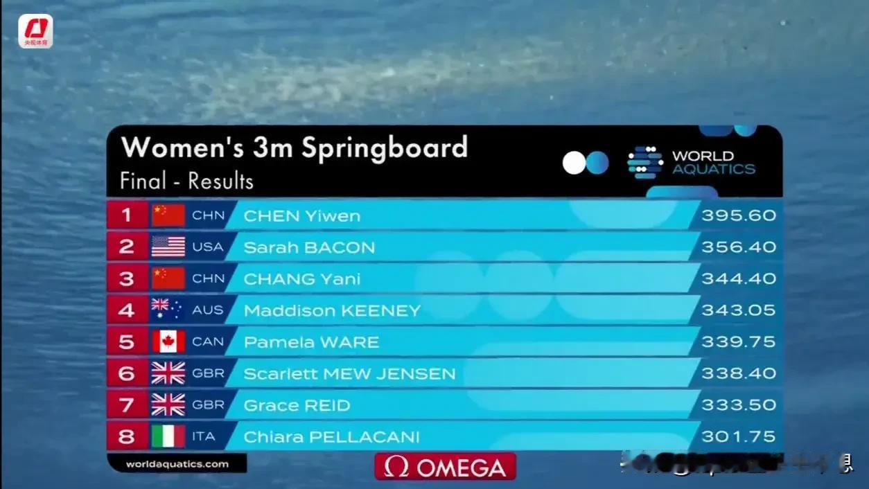 在北京时间3月3日凌晨刚刚结束的2024跳水世界杯蒙特利尔站女子三米板决赛中,中国选手陈艺文(395.60分)、昌雅妮(344.40分)夺得金牌、铜牌。