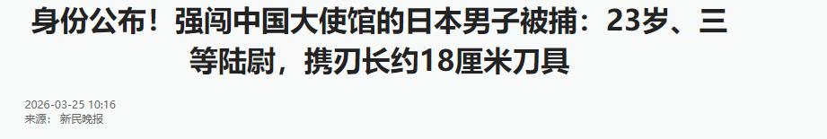 23岁少尉携刀翻墙这事发生在2026年3月24日上午9点左右,主角是日本陆上自卫队虾野驻屯地的23岁三等陆尉村田见大,他没有走正常渠道,反而从中国驻日大使馆隔壁建筑物4楼翻墙,强行闯入使馆馆区,村田见大闯馆后,中国使馆安保人员反应迅速,立马将他控制,没给其继续作乱的机会。