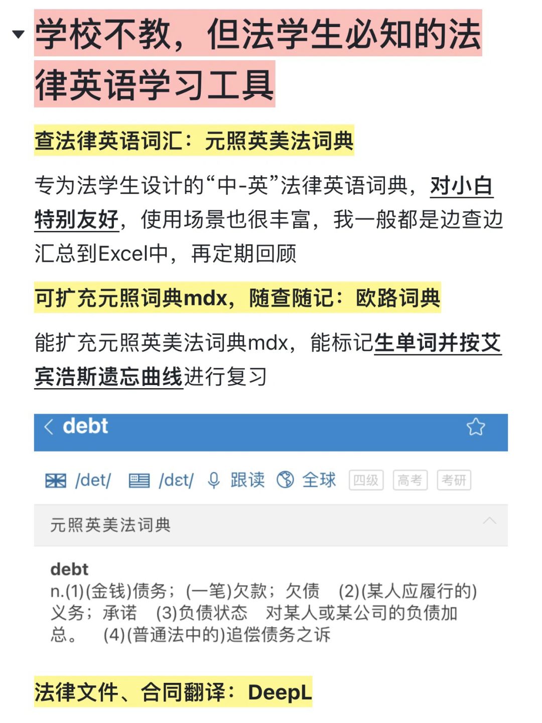 专为法学生设计的“中-英”法律英语词典(可导入至欧路词典使用),对小白特别友好,使用场景也很丰富,我一般都是边查边汇总到Excel中,再定期回顾