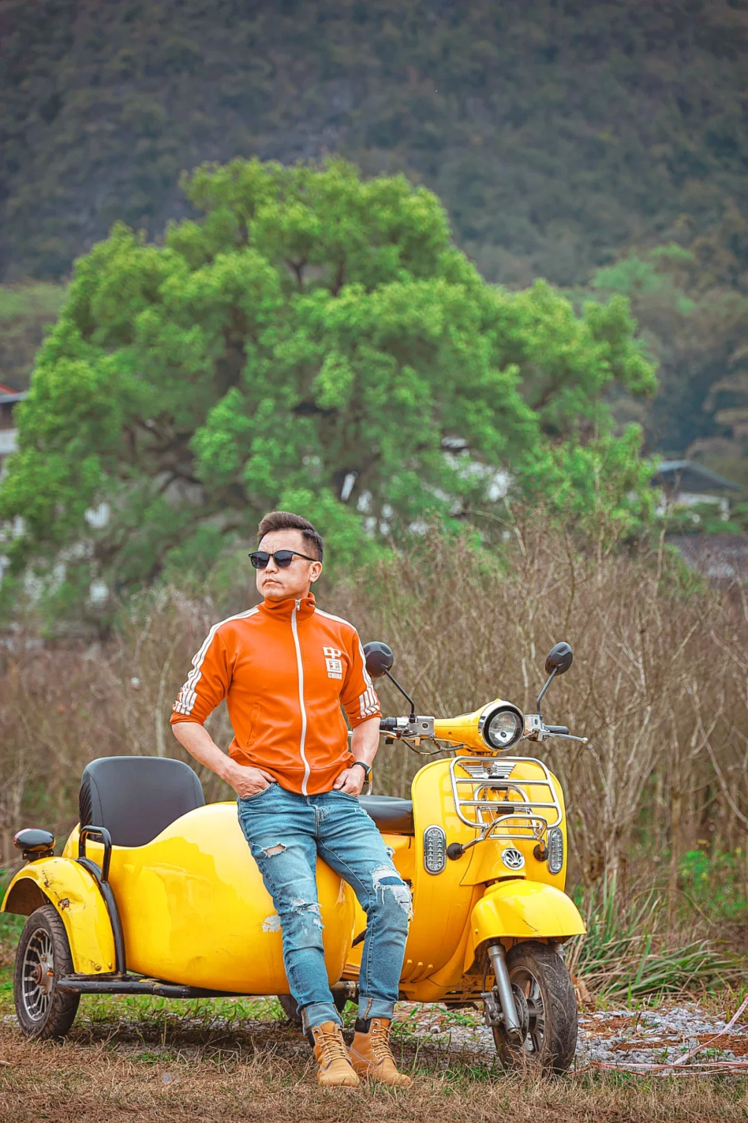 可以租摩托车和竹筏拍照