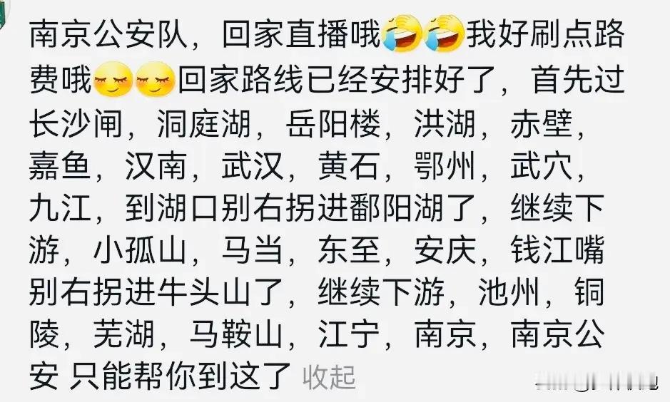 这支南京公安系统精英选拔队伍排前的口号是不夺冠就游回南京,热心网友连路线规划图都做好了,网友们已经搬起小凳子准备围观,游南京公安龙舟队加油,祝大家端午安康!