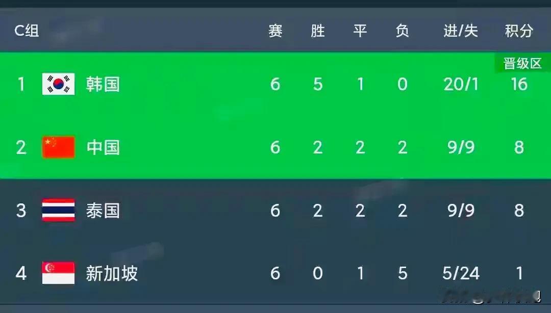 随着泰国男足3-1战胜新加坡,没能取得3个净胜球,最终C组中国男足与泰国男足同积8分净胜球为0,中国男足凭借双方胜负关系优势,最终幸运排名C组第二,与韩国一起晋级2026世界杯亚洲区预选赛18强赛,这心情咋就这么复杂呢?