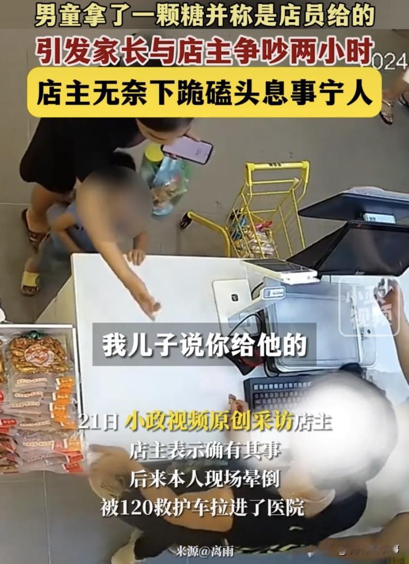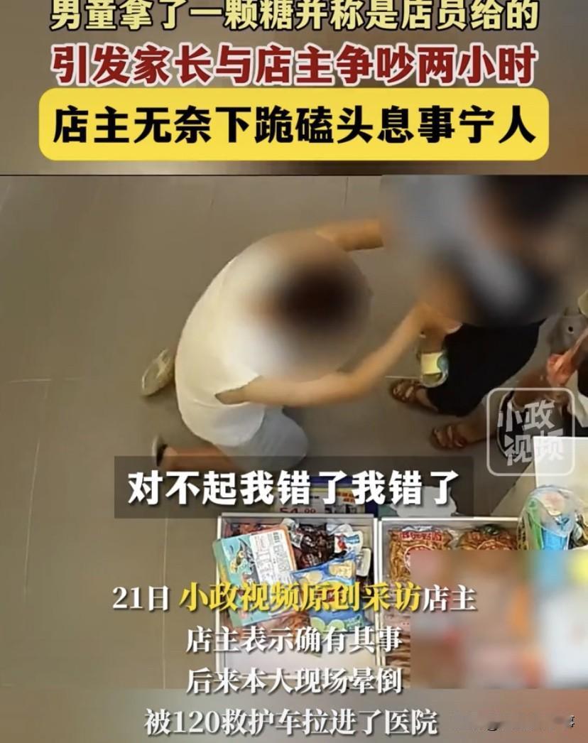 “现在实体店这么难做了吗”?广东东莞,一男童和母亲在超市内购物,结算时,男童偷偷拿了一颗糖,骗母亲说是店员给的,没想到,就因为这颗糖,家长和店主争吵两个小时,最终,店主无奈下跪磕头息事宁人