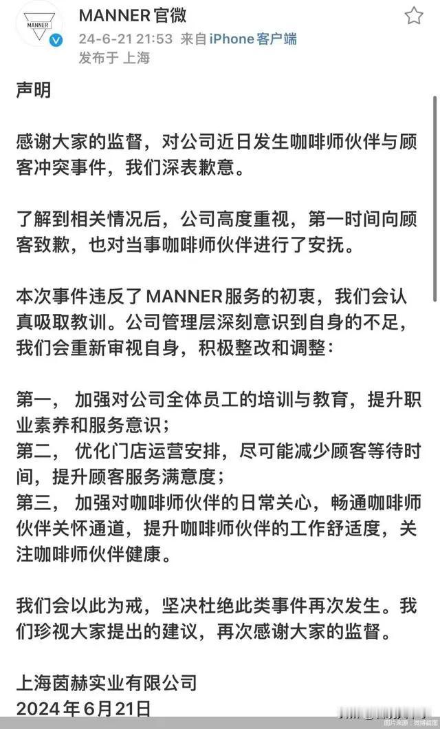 Manner就店员与顾客发生冲突进行道歉了!声称接下来会加强培训与教育,看到了一个有意思的评论:这个事情其实很简单,就是这两个员工已经不珍惜在这里的工作,对企业没有任何的归属感,不愿意从精神上或者身体上为做企业任何的承担