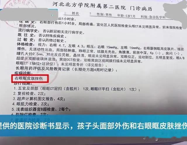 事后,男童的妈妈张女士介绍,当时孩子朝着邻居喊了句“儿子”,结果就发生了视频中的一幕,男邻居用脚踢男童的后脑和太阳穴,根据医院诊断书显示,孩子头面部被打成外伤,另外孩子右眼眶附近的皮肤也有挫伤