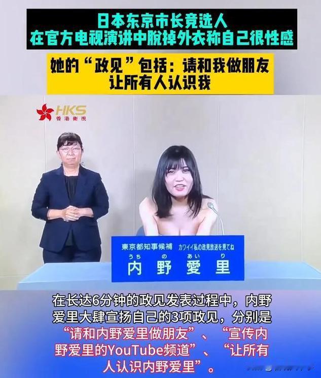 离了大谱!日本东京市长竞选时,一名女候选人上台后来了一段非常“炸裂”的表演,她在发言过程中突然以天气炎热为由,脱去了外衣并摘下眼镜,称自己“既可爱又性感”,网友:这是真给民众谋福利啊