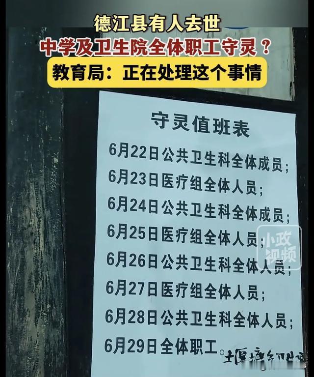 从网传中学工会发出的“守灵安排表”来看,可以用“兴师动众”来形容,时间从6月22日至6月29日,语文组打头阵,6月29日音体美组是最后一组,6月30日集体守灵,从6月22日一直持续到6月30日,每天都有教研组为其守灵。卫生院也是,每天都有排班,最后一天集体守灵