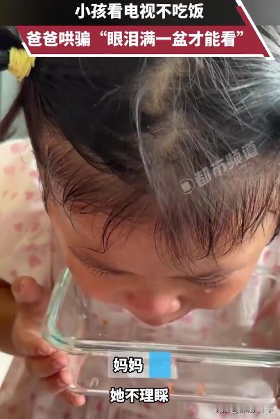 这当爹的太不靠谱了!广西玉林,一位爸爸做好饭后,无论怎么呼唤女儿都没有回应,发现女儿沉迷电视,爸爸一怒之下关掉电视,见女儿大哭,爸爸又拿来一个空碗,跟女儿说“你把眼泪满一盆就能看电视了”,而这一行为,也引起了不小争议