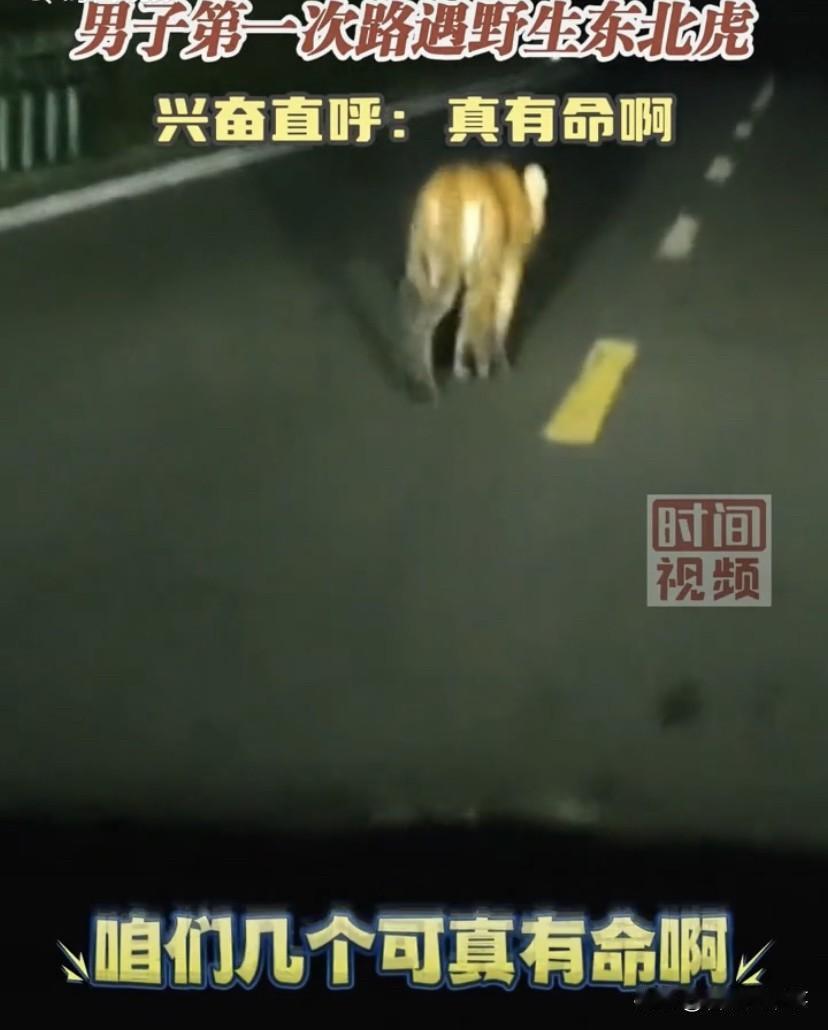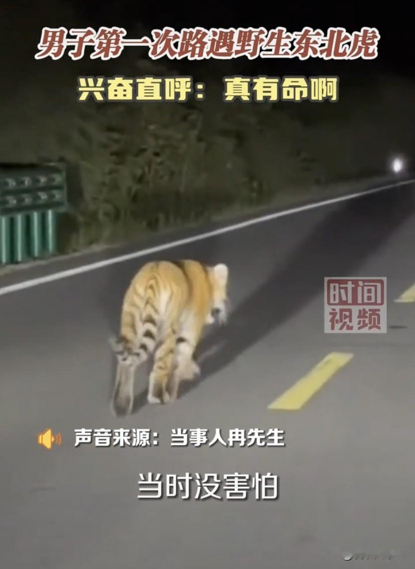太虎了!黑龙江,一男子夜间在国道开车,突然发现一只野生东北虎在车前散步,男子不但没有害怕,反而开着车尾随老虎进行拍摄,还兴奋地大喊:真有命啊!网友:要不你下去跟它握握手?