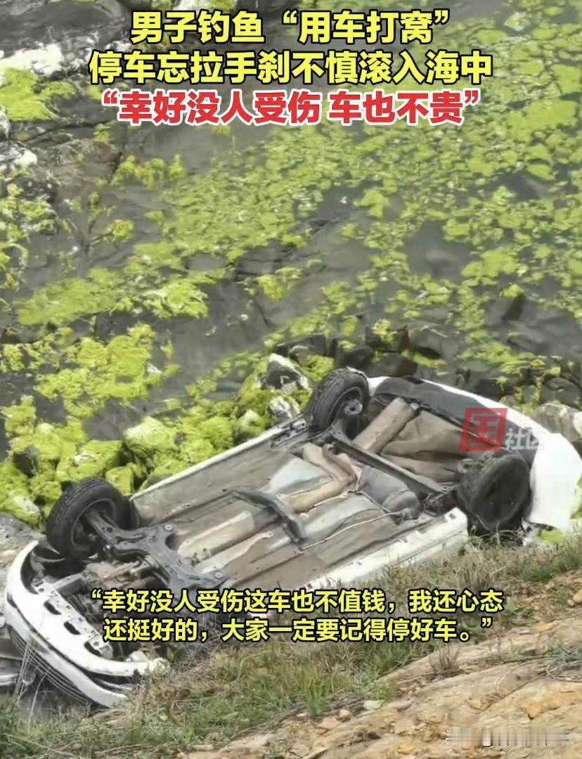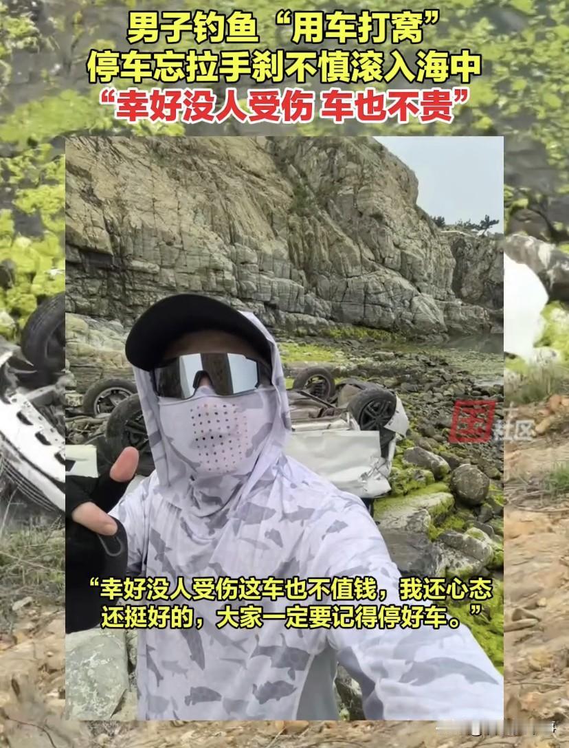 这成本太大了!山东青岛,男子开车出门钓鱼,不料,车子手刹还没拉就直接下了车,等发现时,车子已经滚下山坡掉进海里,事已至此,男子淡定的拍了一张合影,网友:现在钓鱼这么卷了?都开始用车打窝了!