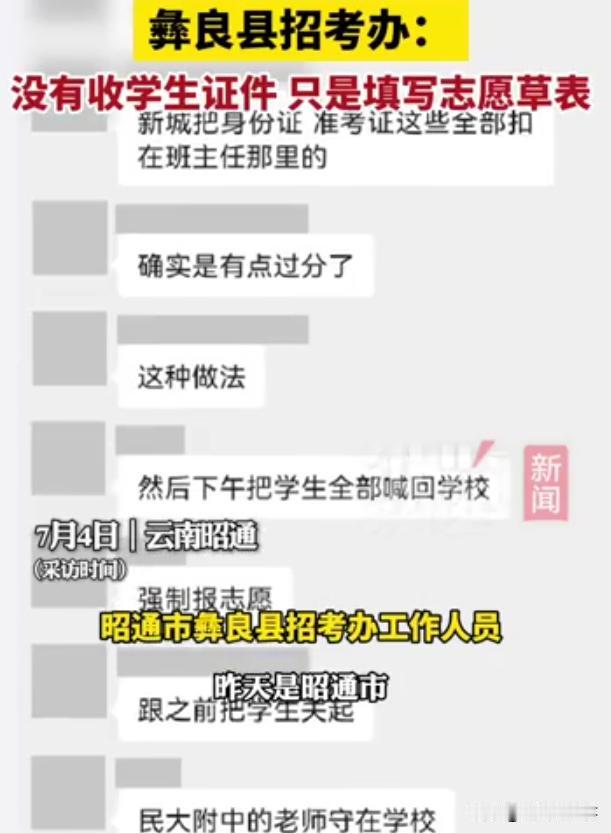 网传图片内容疑似家长群聊天记录,根据内容来看,彝良县新城中学的一位班主任老师在中考志愿填报时,收了学生的身份证和准考证,把学生们关起来,强迫学生填报云南民大附中彝良高级中学,其中,还有民大附中的老师守在学校里