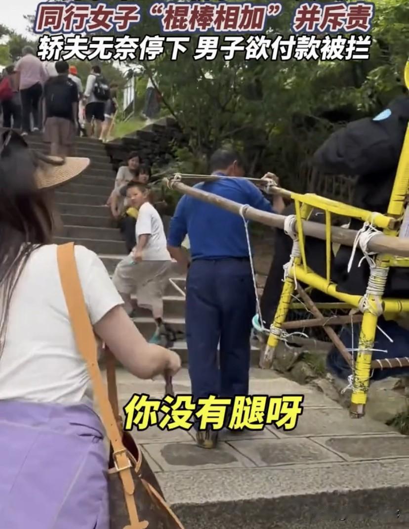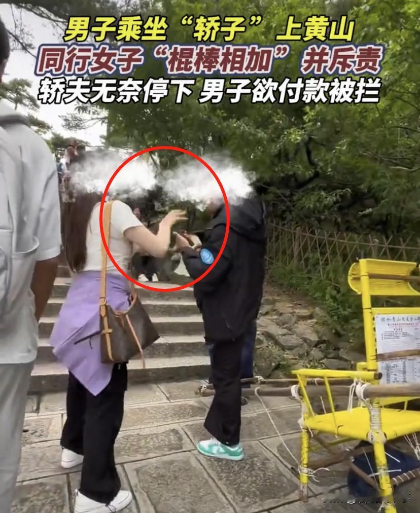 网传视频显示,当时景区爬山的人并不少,一名男子坐在黄色藤椅上,享受着轿夫的爬山服务,这时,同行女子看到后,直接就跑过来,“棍棒相向”地训斥着男子