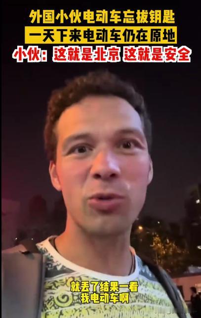 “这就是北京”!一位在北京生活的外国小伙不小心忘记拔下电动车钥匙,本以为电动车可能会丢,没成想过去一天,车子依旧停在原地安然无恙,随后小伙发视频感慨:在中国太幸福!