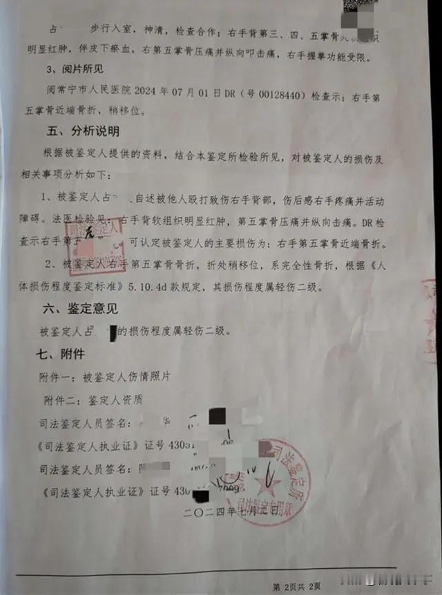 事情很快升级,双方的言语争执演变为肢体冲突。据村民的儿子称,当时三人乘坐的是一辆宝马,冲突中,村民的大儿子受伤,后经医院诊断为第五掌骨骨折,属于轻伤二级