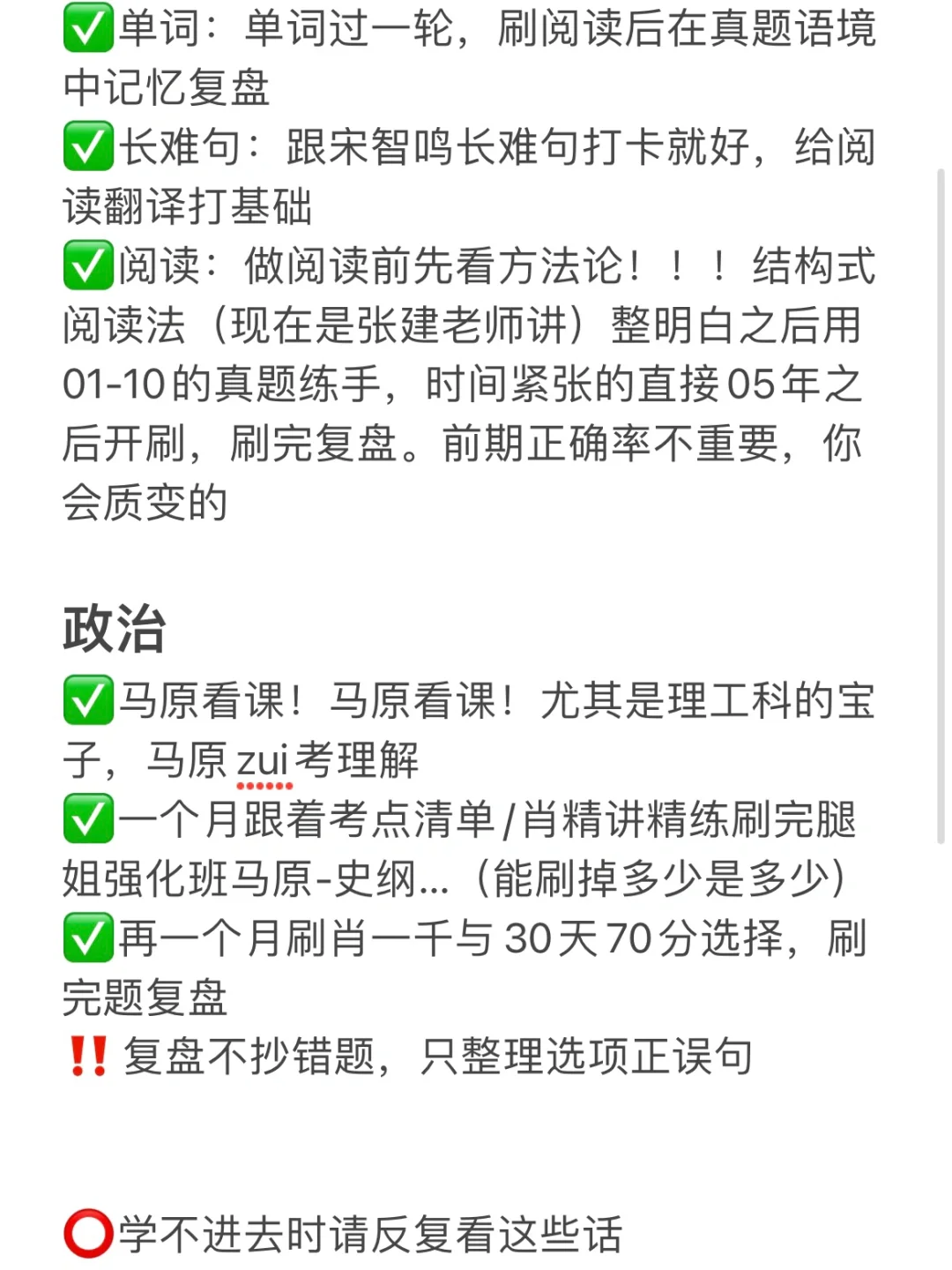 ✅阅读:做阅读前先看方法论!!!结构式阅读法(现在是张建老师讲)整明白之后用01-10的真题练手,时间紧张的直接05年之后开刷,刷完复盘。前期正确率不重要,你会质变的