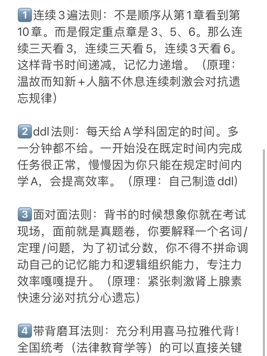 1⃣️连续3遍法则:不是顺序从第1章看到第10章。而是假定重点章是3、5、6。那么连续三天看3,连续三天看5,连续3天看6。这样背书时间递减,记忆力递增。(原理:温故而知新+人脑不休息连续刺激会对抗遗忘规律)