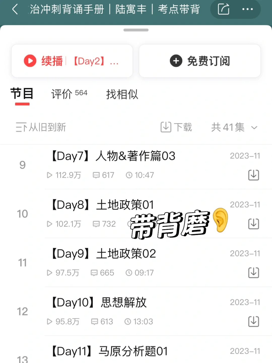 4⃣️带背磨耳法则:充分利用喜马拉雅代背!全国统考(法律教育学等)的可以直接关键词搜索到带背。也可以自己背书的时候录音,后面反复磨耳朵。后期听腿姐的政治带背,巩固知识点。(原理:潜移默化 听多了仿佛有人在你耳边报答案)