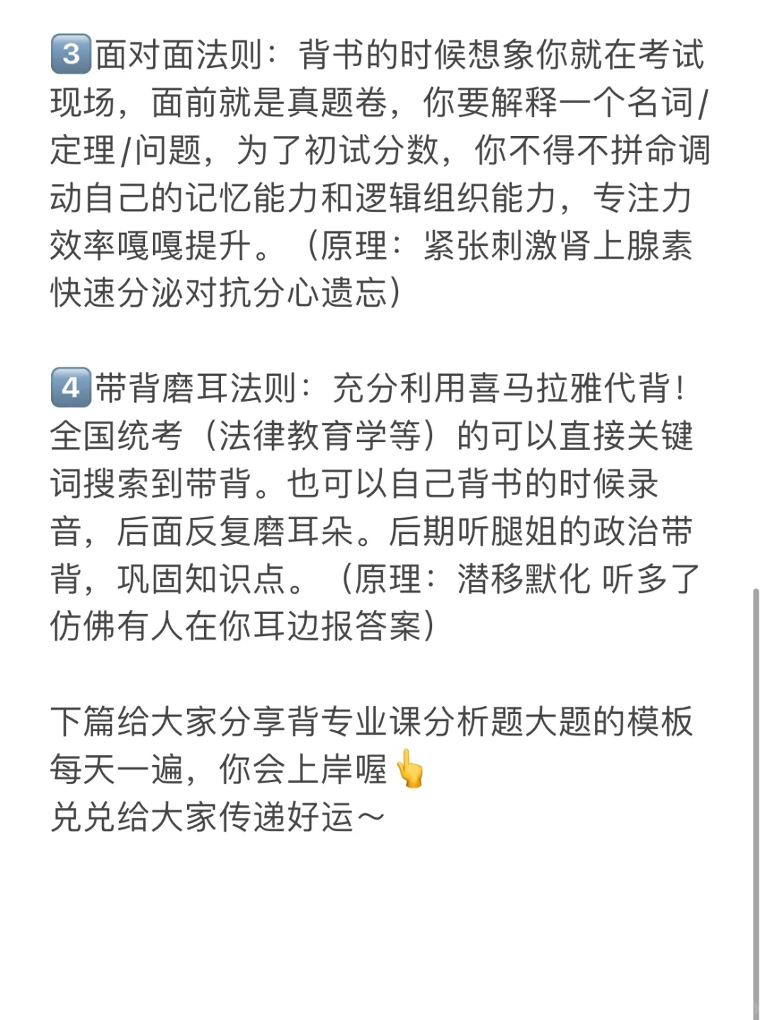 3⃣️面对面法则:背书的时候想象你就在考试现场,面前就是真题卷,你要解释一个名词/定理/问题,为了初试分数,你不得不拼命调动自己的记忆能力和逻辑组织能力,专注力效率嘎嘎提升。(原理:紧张刺激肾上腺素快速分泌对抗分心遗忘)