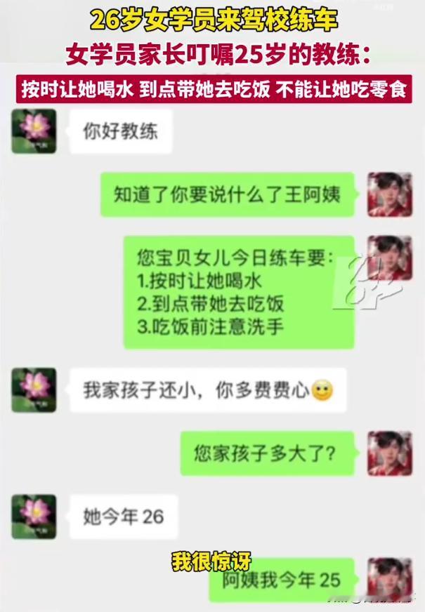 妈宝女?广西南宁,一名26岁女生去驾校学开车,女孩妈妈不放心,便找到教练,发信息嘱咐要监督女儿喝水,吃饭,不能吃零食,男教练一看回复道:阿姨,我才25岁!