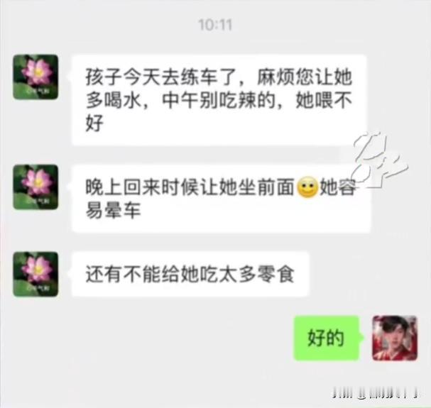 单看聊天记录,很难想象这是驾校教练和学员家属的通话,更像是幼儿园大班的家长,对孩子老师的嘱咐