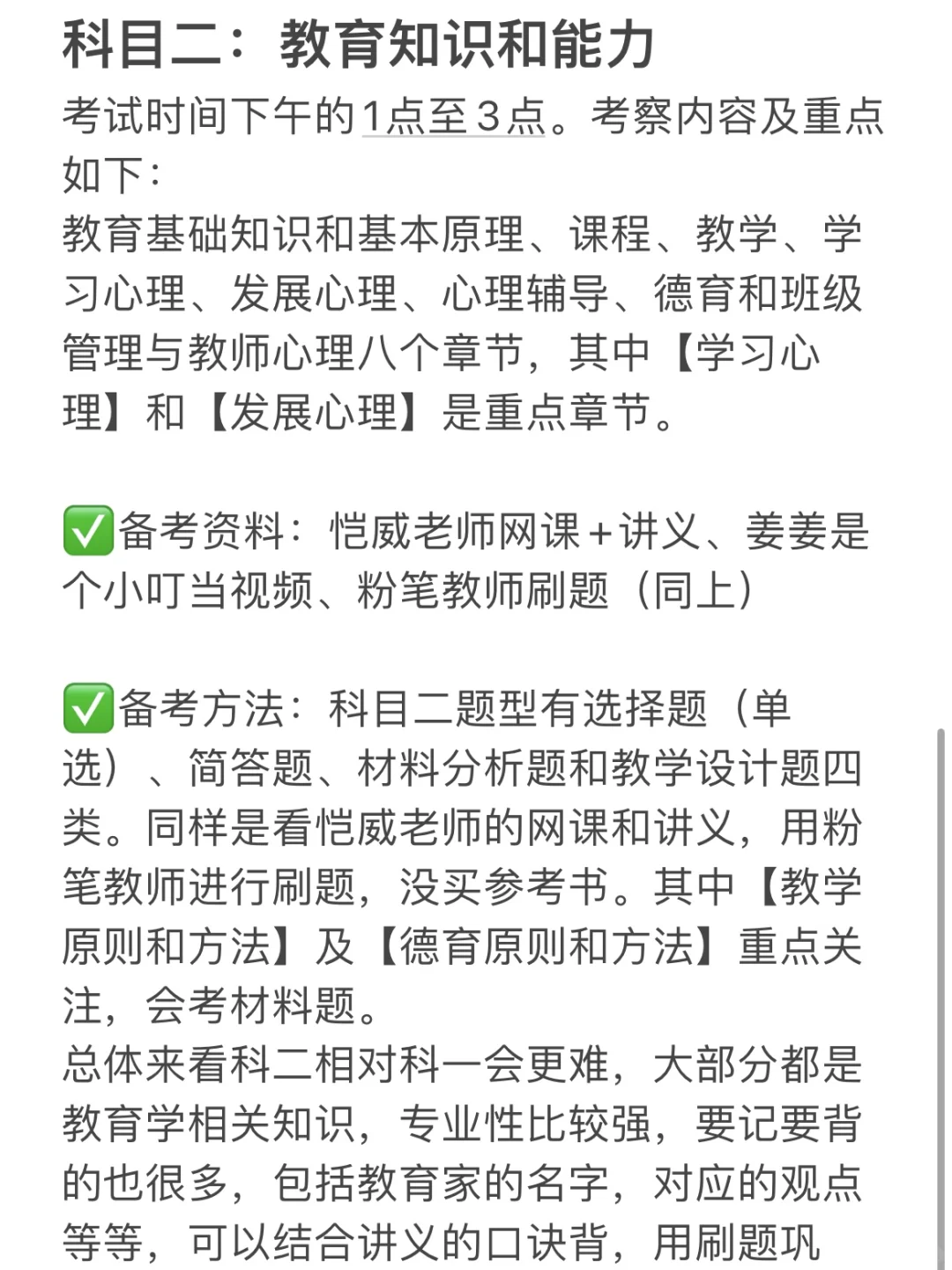 [拳头R]备考方法:科目二题型有选择题(单选)、简答题、材料分析题和教学设计题四类。同样是看恺威老师的网课和讲义,用粉笔教师进行刷题,没买参考书。其中【教学原则和方法】及【德育原则和方法】重点关注,会考材料题。