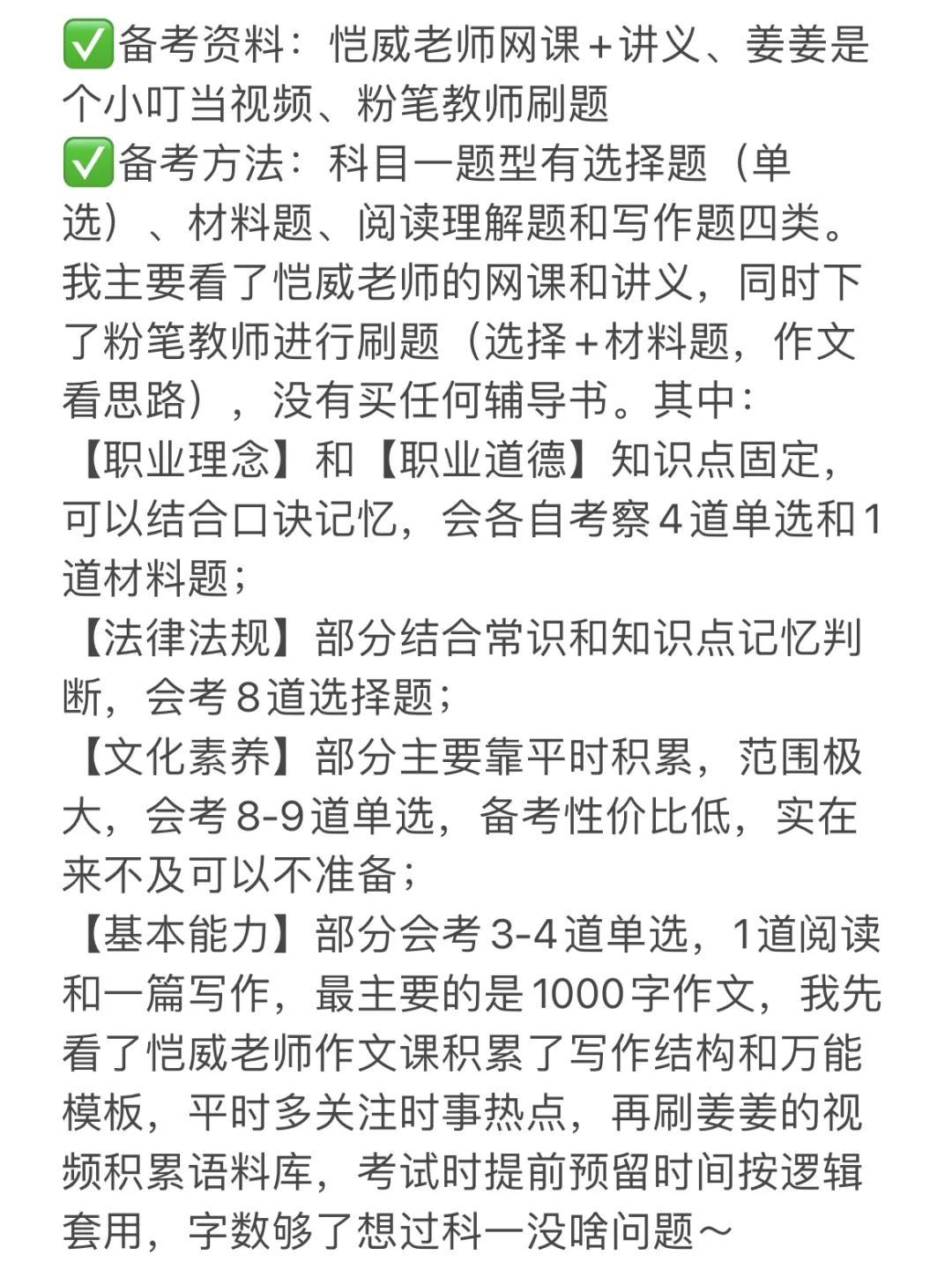 [拳头R]备考方法:科目一题型有选择题(单选)、材料题、阅读理解题和写作题四类。我主要看了恺威老师的网课和讲义,同时下了粉笔教师进行刷题(选择+材料题,作文看思路),没有买任何辅导书。