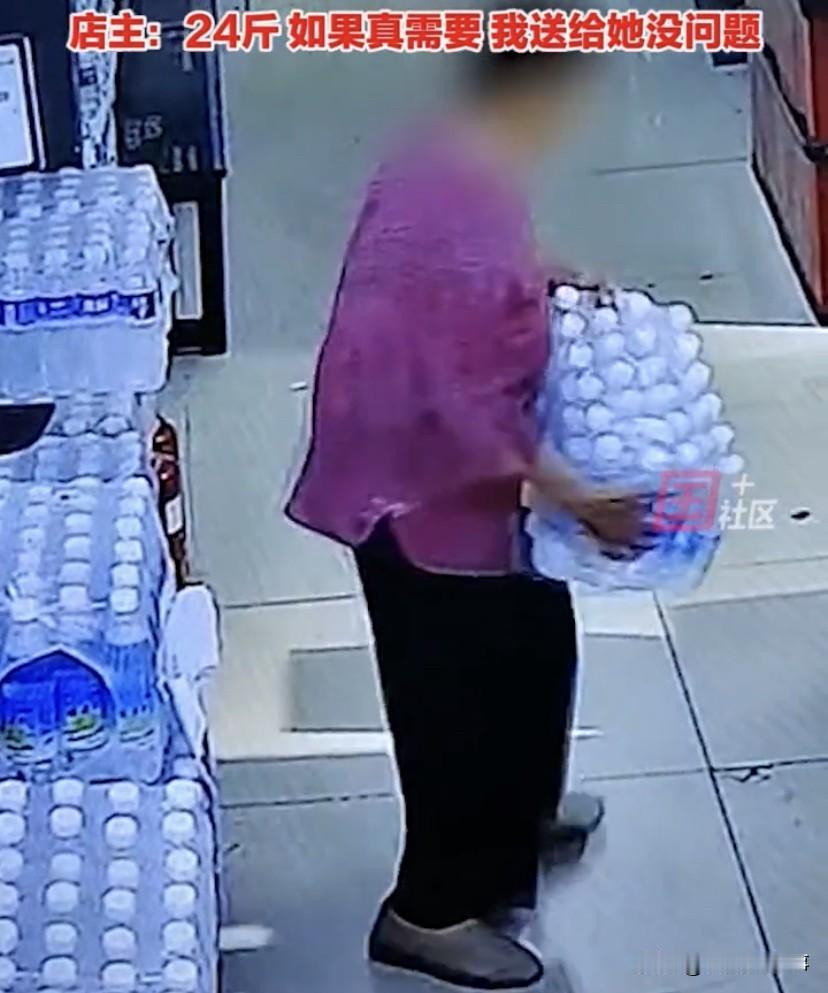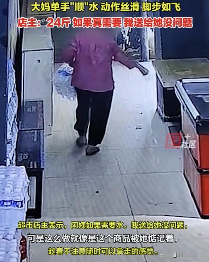 超市老板表示,这一箱水有24斤左右,阿姨如果需要水,把水送给她都可以,但现在这种行为,就好像是这个商品被她惦记着,只要趁着别人不注意,随时都可以拿走的感觉,事后,她也将视频发到了业主群里,提醒阿姨来买单,并没有选择报警,也是照顾老人在儿女面前的脸面