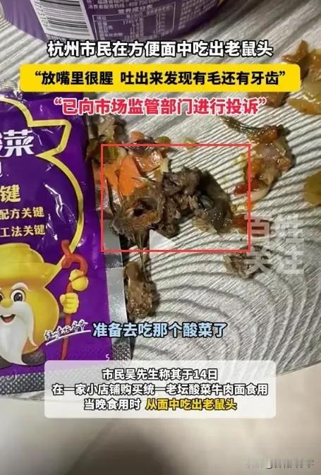 太恶心了!浙江杭州,男子买了一桶老坛酸菜方便面,不料,在食用过程中,突然觉的嘴里很腥,似乎还有毛发,吐出来一看,竟然是老鼠头,甚至还有牙齿,男子当场反胃,并向市场监管部门进行投诉