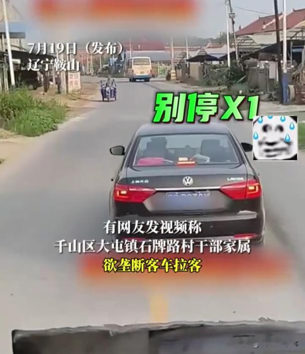 视频拍摄者表示,这是千山区大屯镇石牌路村干部家属想要垄断拉客而有意为之,前面过去的小客车,就是村长小妹的车,挡在前面的黑色轿车,则是村长家的车,目的就是让前车多拉点客