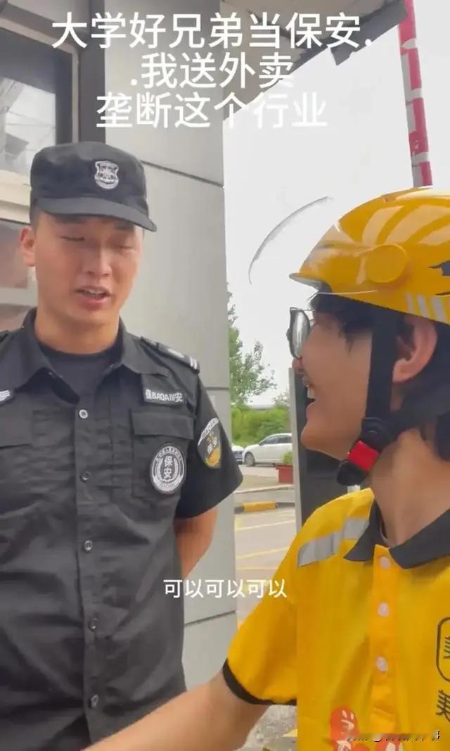 有网友说:他们同是沦落人,说好的上大学会有一个好的前途,谁能想到如今一个当保安,一个送外卖